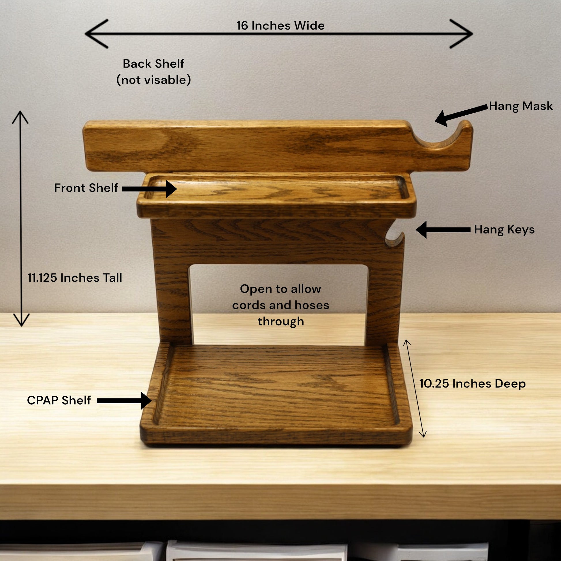 This CPAP stand is made from solid Oak and proudly crafted in the USA. The stand will hold and organize your CPAP, mask, keys, rings, change, wallet, phone, TV remote, and watch. It also includes a place to hang your mask to keep it off the floor and nightstand. The stand is stained and finished smooth to the touch. The stand measures 11.125 inches tall by 16 inches wide and 10.25 inches deep.