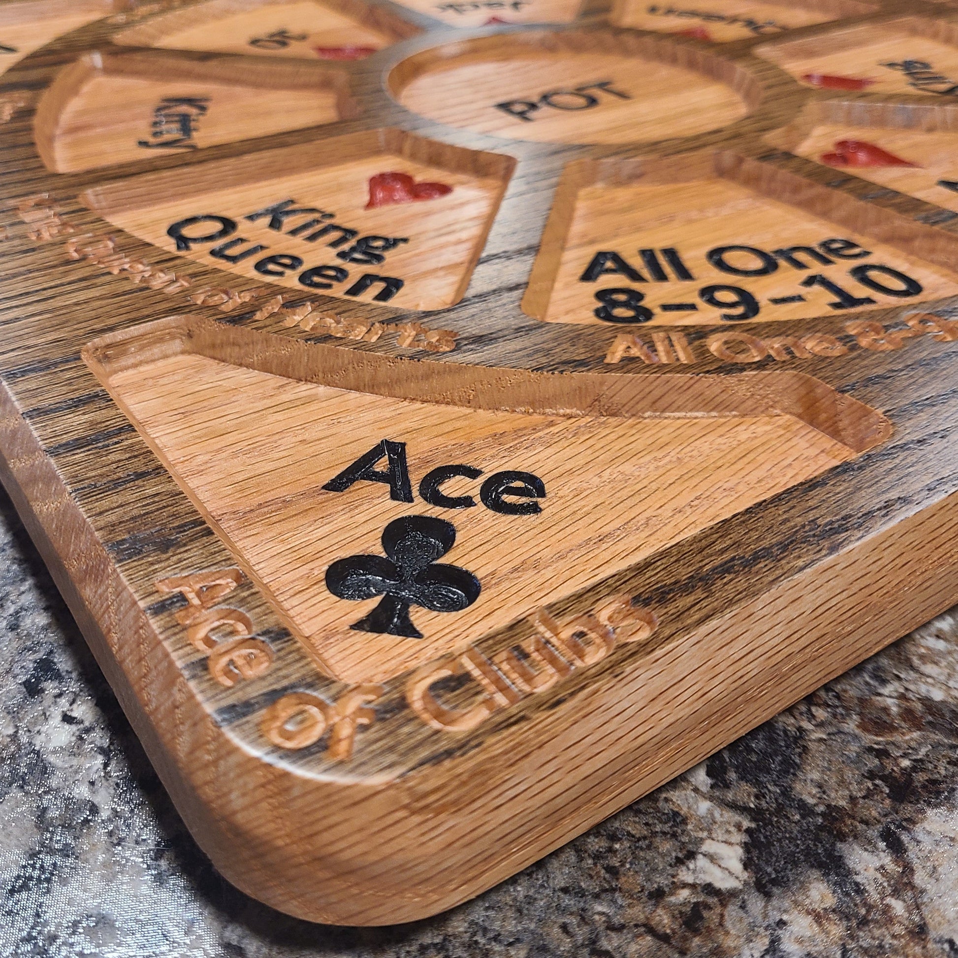 This limited-edition game board (a combination game of Poker, Hearts and Rummy) is milled from solid red oak that is approximately 16"x16" and is 3/4 inch thick. It is custom crafted and made in the USA. Pockets are created and labeled (both inside and out) for the different pots used in the game to hold chips or coins. Text and symbols are hand painted. Text, Clubs and Spades are painted black. Hearts and Diamonds are painted Red. The board is sealed and finished. Cards not included. This popular edition is the 6-7-8 version with a Turn Table attached. Please note, some pictures may display other versions.